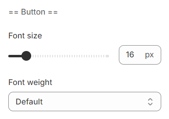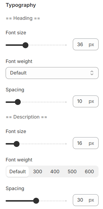 Typography settings include customization options for headings, subheadings, and descriptions. You can adjust the Font size and Font weight for each of these text elements to match your design preferences.