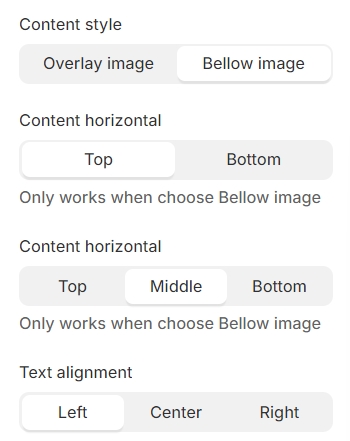 Content horizontal: Specify the horizontal placement of the content as either at the top or bottom of the image or section.