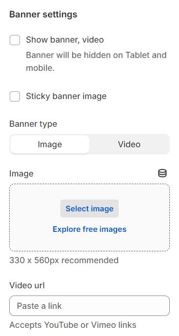 Show banner, video: Activating this will display the banner on desktop devices while ensuring it remains hidden on tablets and mobile for a tailored viewing experience.