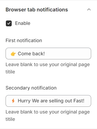Browser tab notifications, which help bring back the attention, will appear on browser tab after your customers leave your website for a certain amount of time.
